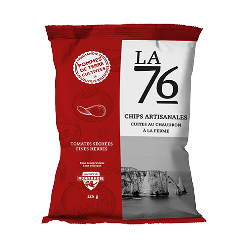 Chips la 76 Tomates séchées Fines Herbes Chips artisanales cuites au chaudron Tomates séchées et fines herbes Labels du produit